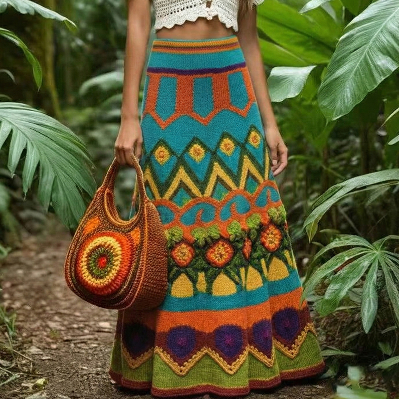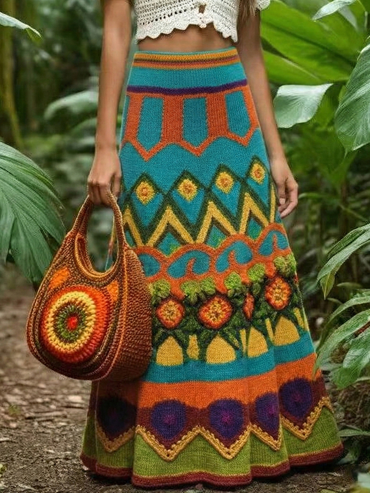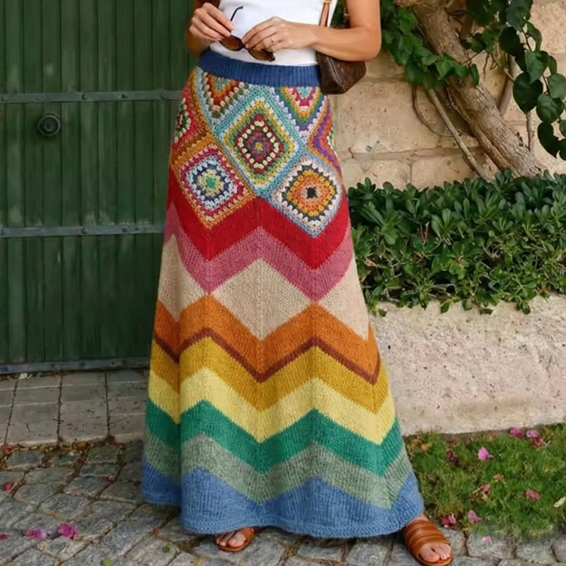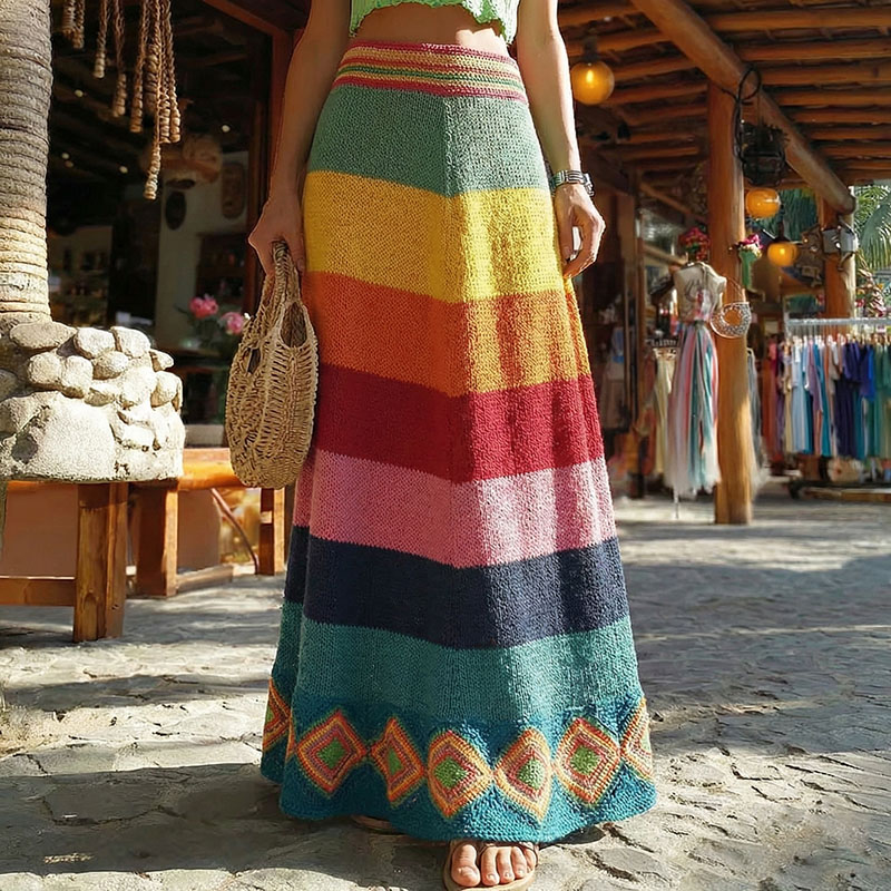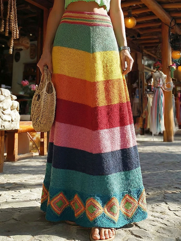 Vintage Classy Spring Rainbow Vacation Colorblock Art Cozy Knitted Skirt