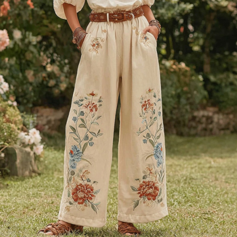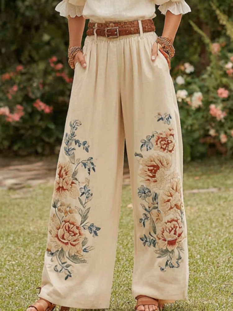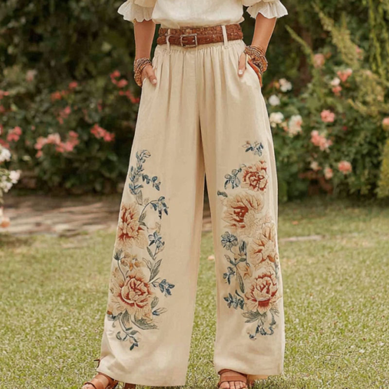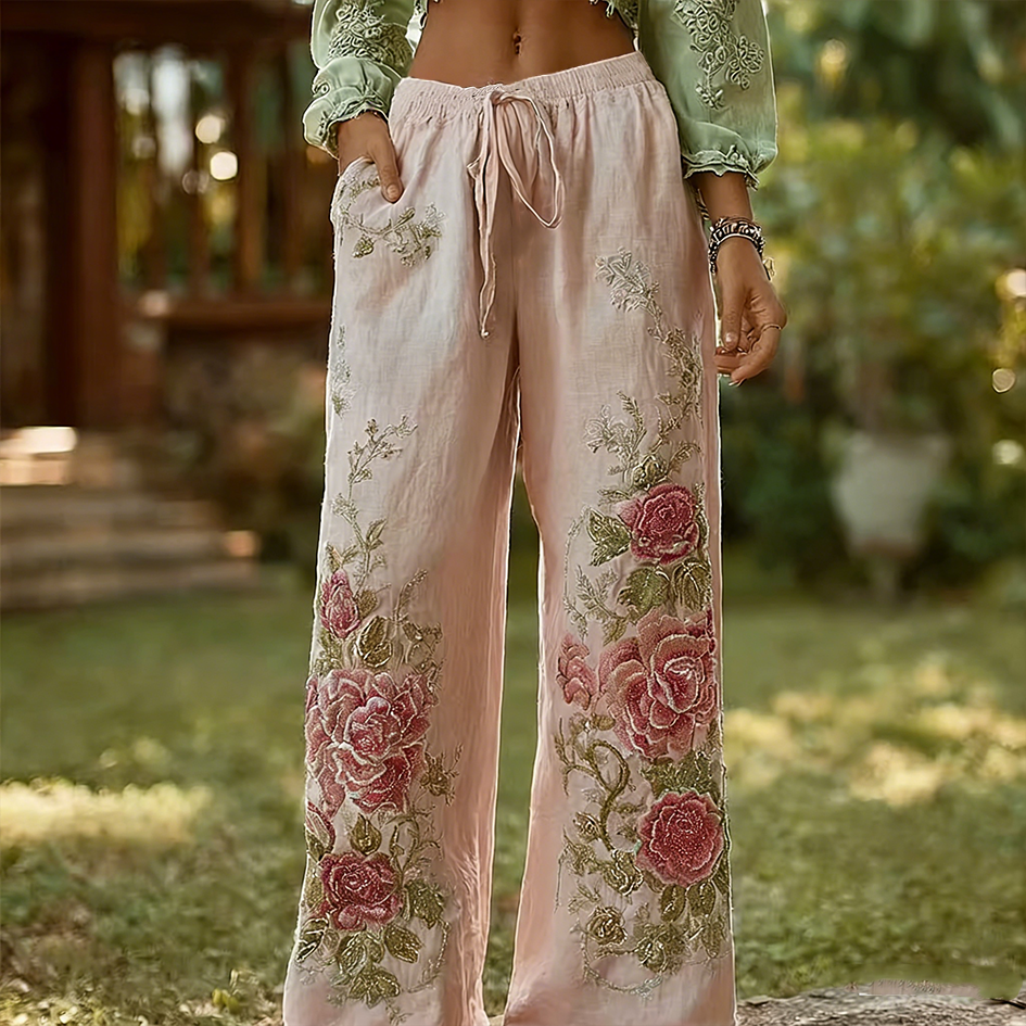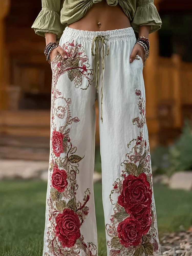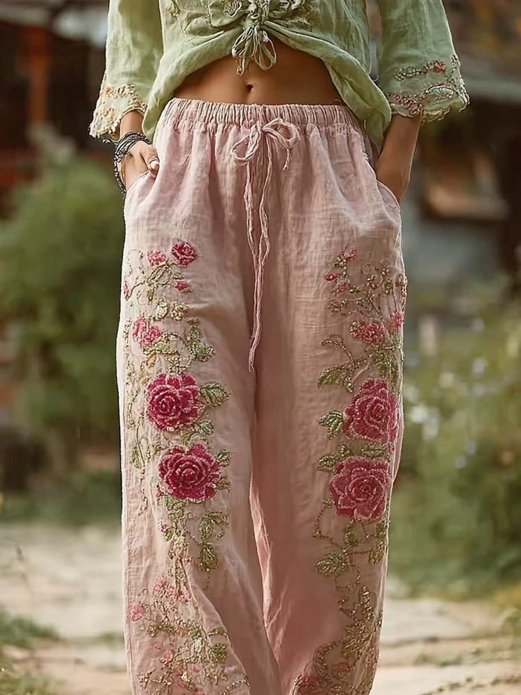 Women's Retro Bohemian Rose Art Linen Pants