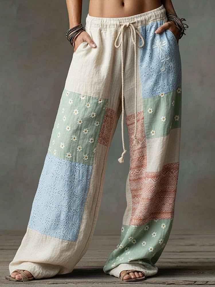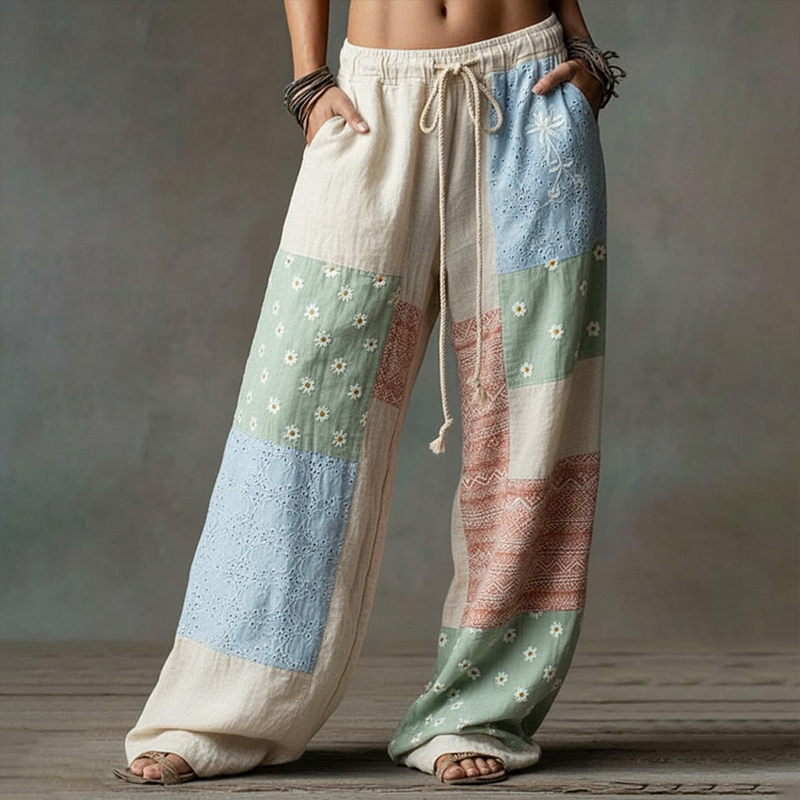 Women's Retro Bohemian Floral Patchwork Casual Linen Trousers