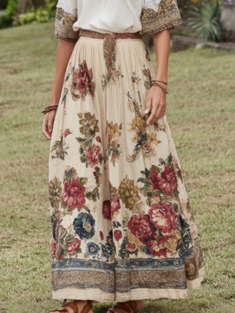 Women's Vintage Spring Floral Embroidered Art Print Flowy Linen Blend Casual Skirt