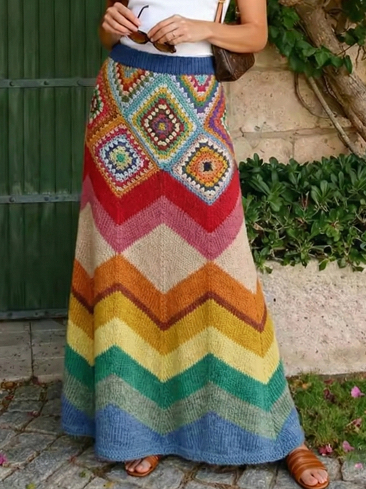 Vintage Classy Spring Vacation Color Block Rainbow Art Cozy Knitted Skirt