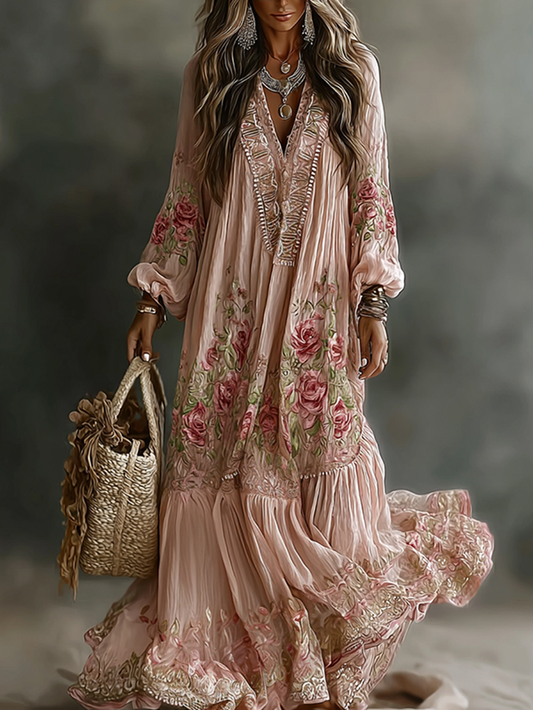 Women's Retro Bohemian Art Floral V-neck Long-sleeved Dress.