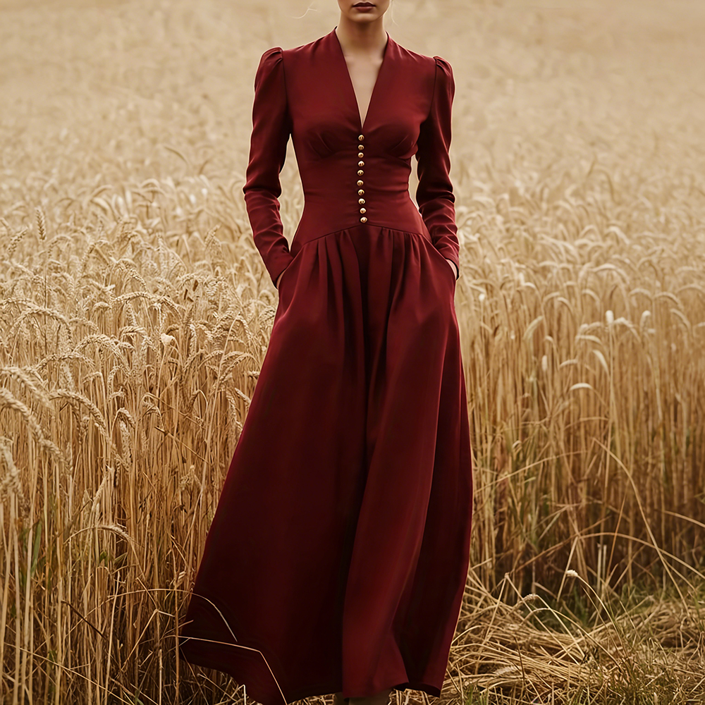 Vintage Classy Long Sleeve Pleated Maxi Dress