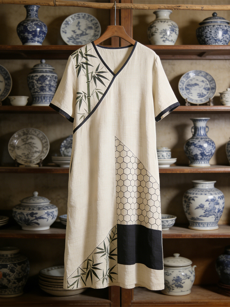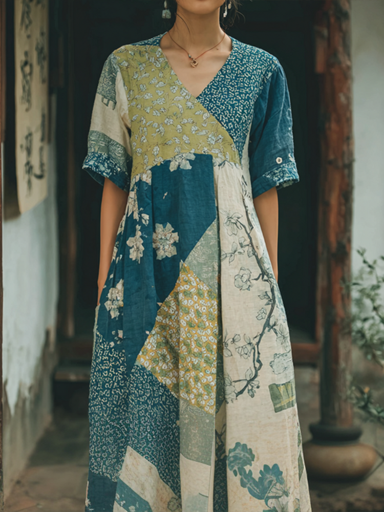 Japanese Art Retro Geometric Patchwork Plant Flower Print Women's V-neck Cotton And Linen Dress