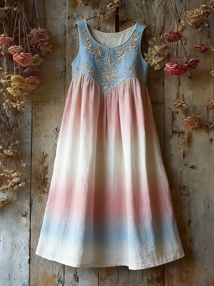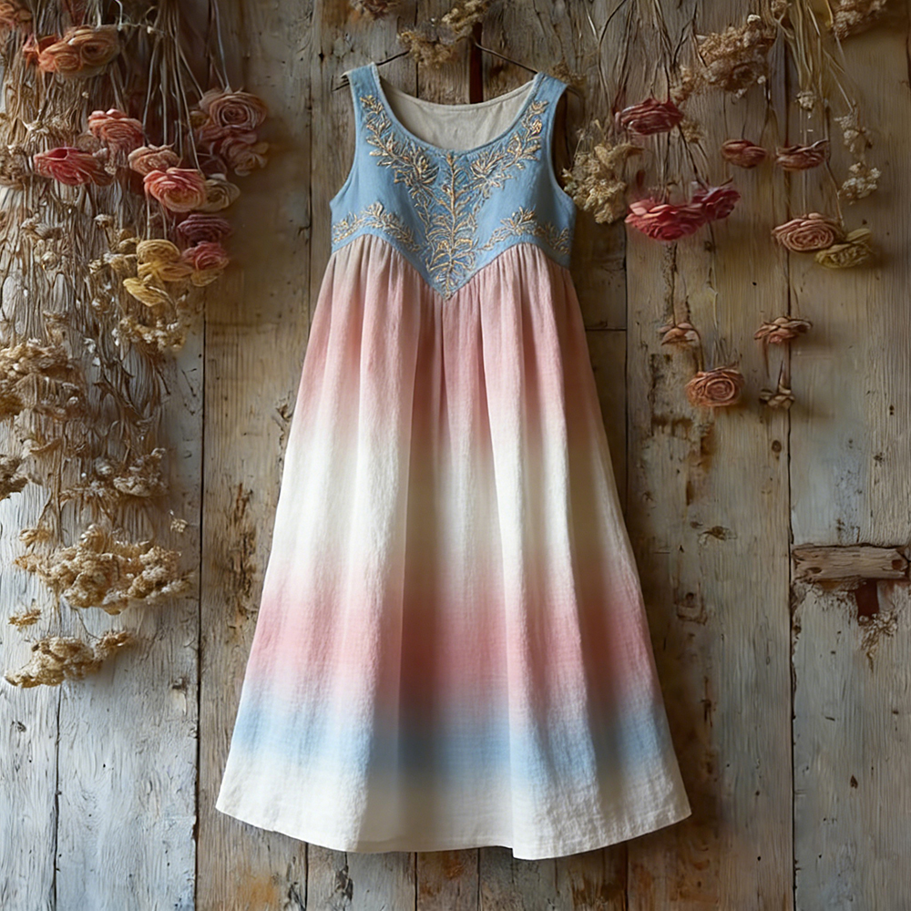 Vintage Trans Flag Color Gradient Floral Linen Midi Dress