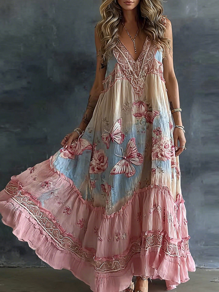Women's Floral And Butterfly Art Print Flowy Linen Blend Casual V Neck Maxi Dress