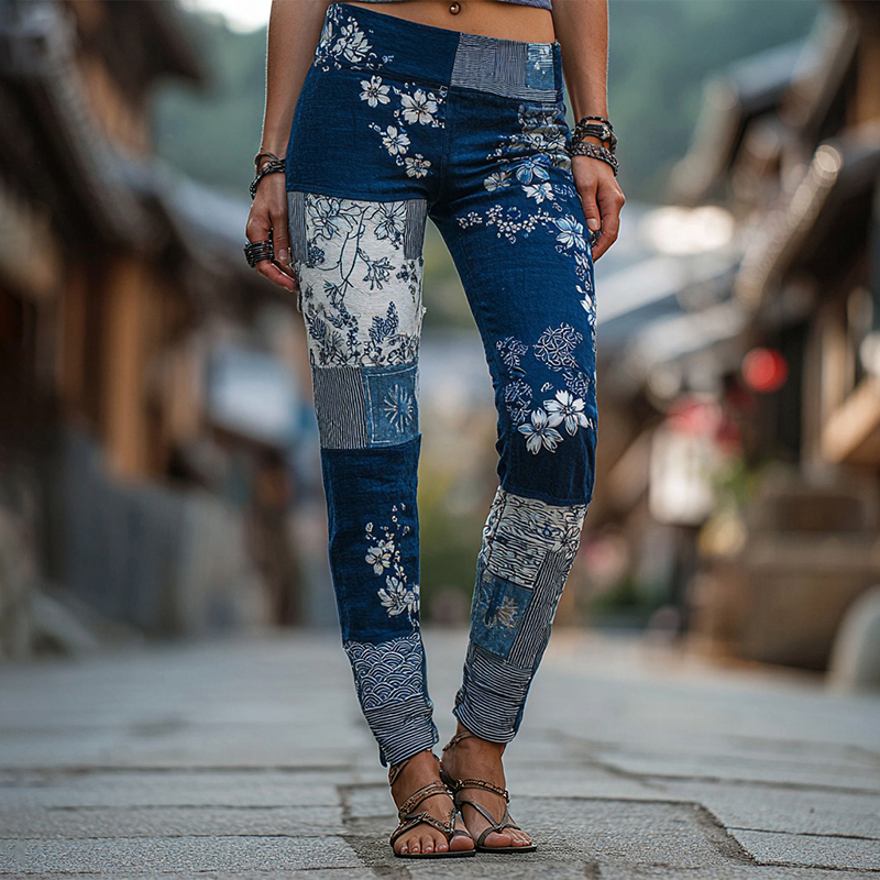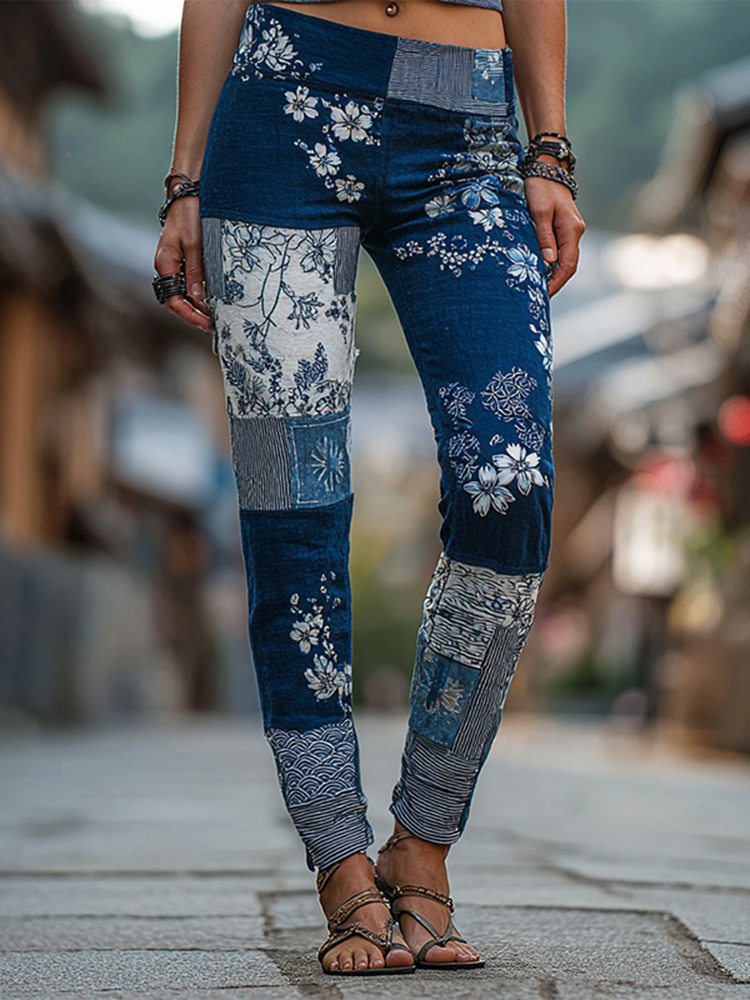 Women's Japanese-style Floral Art Pattern Casual Leggings