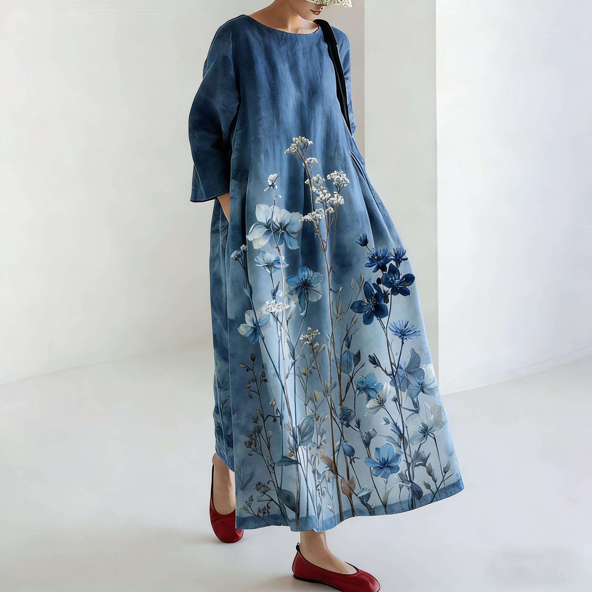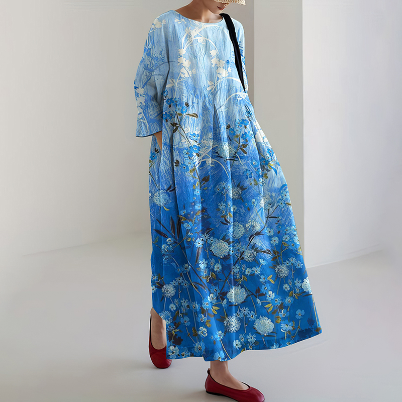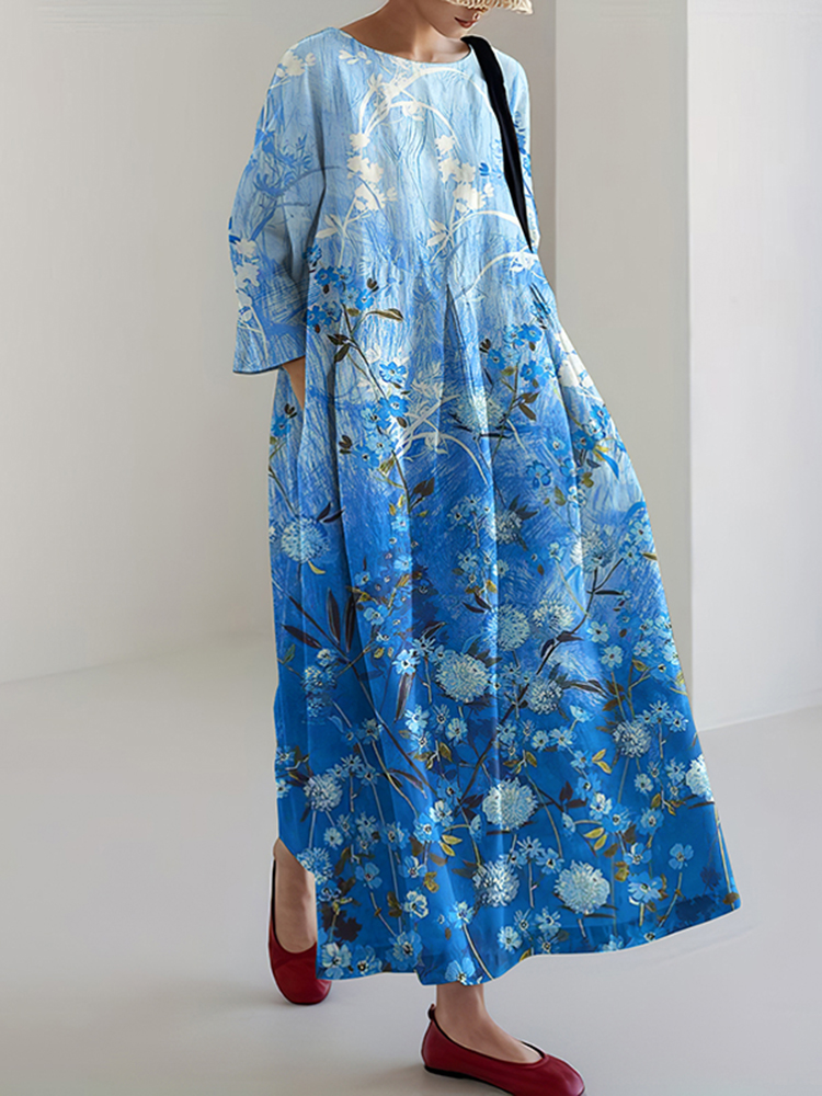 Vintage Japanese Floral Art Gradient Pattern Flowy Linen Maxi Dress