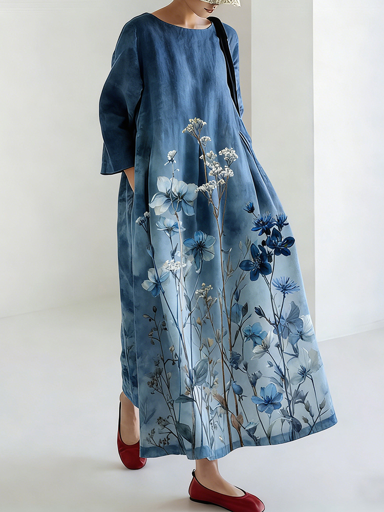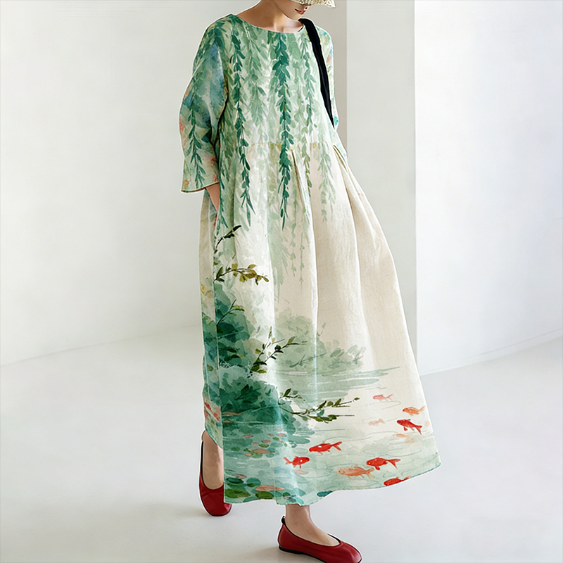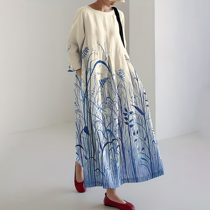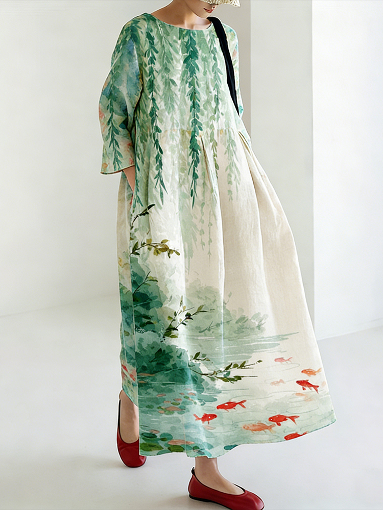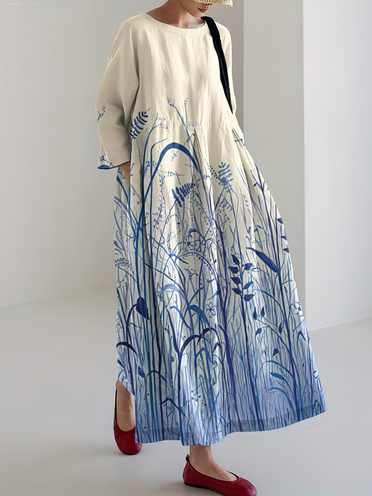 Women's Japanese Ink Painting Style Ocean Plant Pattern Comfortable Dress