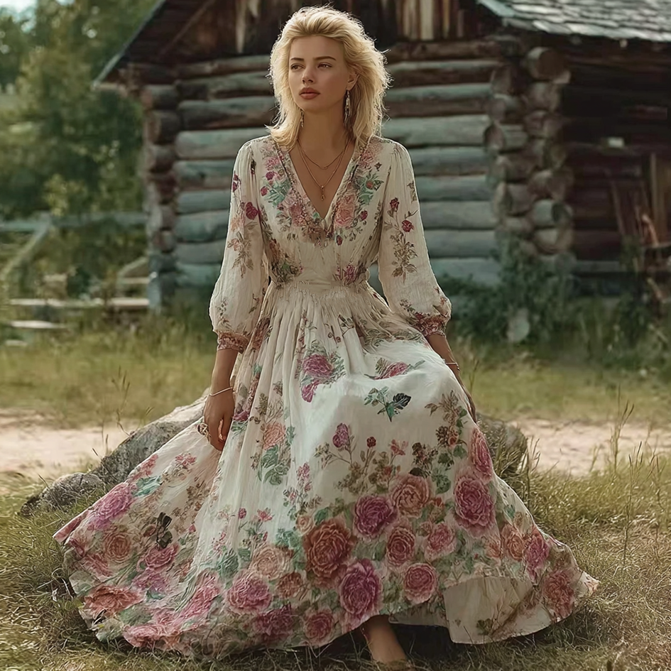 Elegant Rose Floral Pattern V-neck Long-sleeved Dress For Women