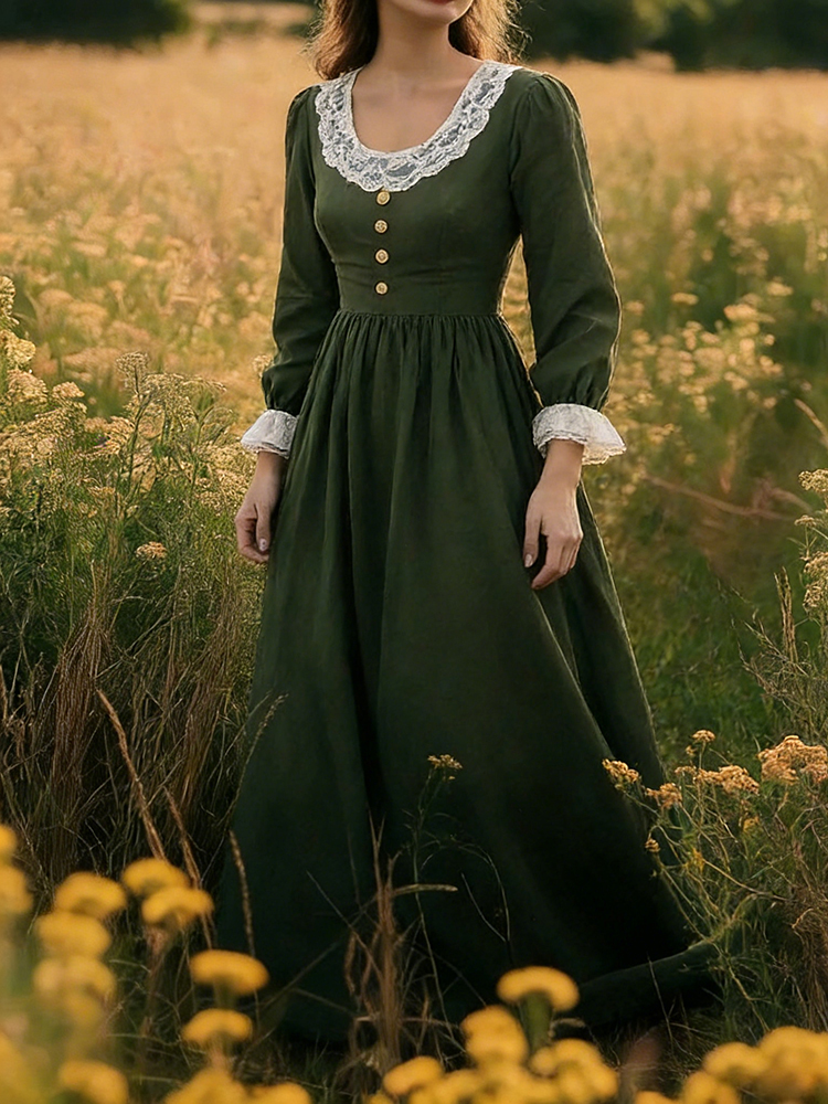 Vintage Lace Patchwork Pleated Linen Maxi Dress