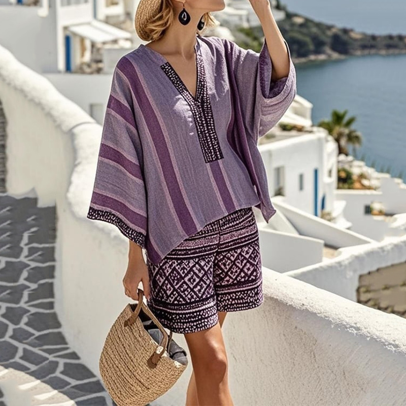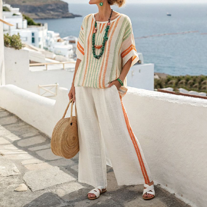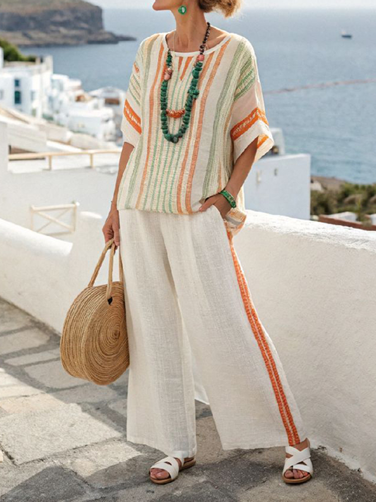 Women's Leisure Linen Ethnic Stripes Holiday Two Piece Set