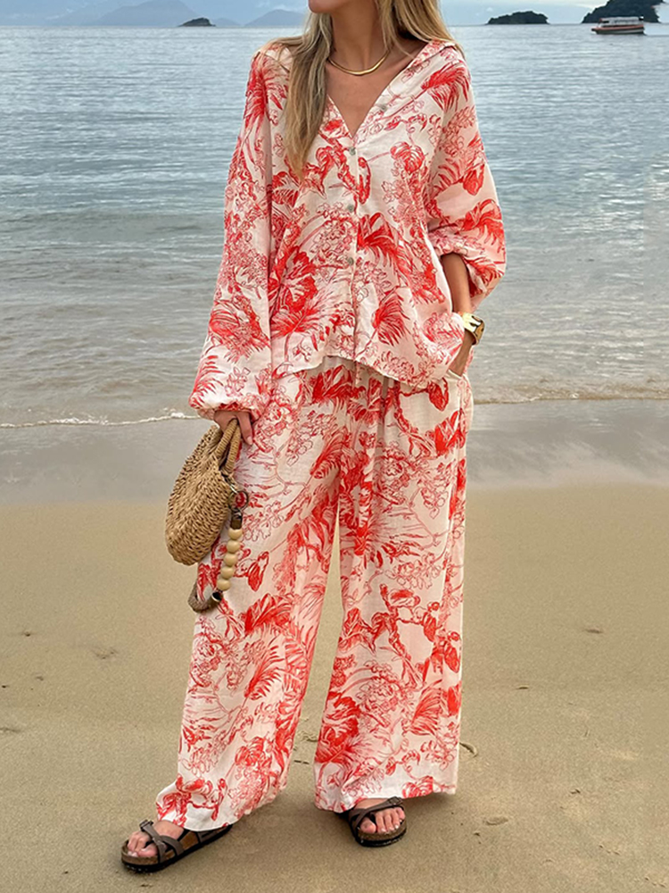 Women's Fashion Ethnic Floral Linen Long Sleeve Pants Two-piece Set