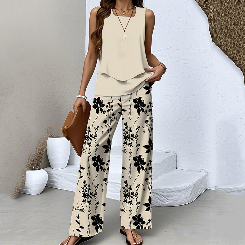Flower Print Double Layer Sleeveless Tank Pants Two Piece Set
