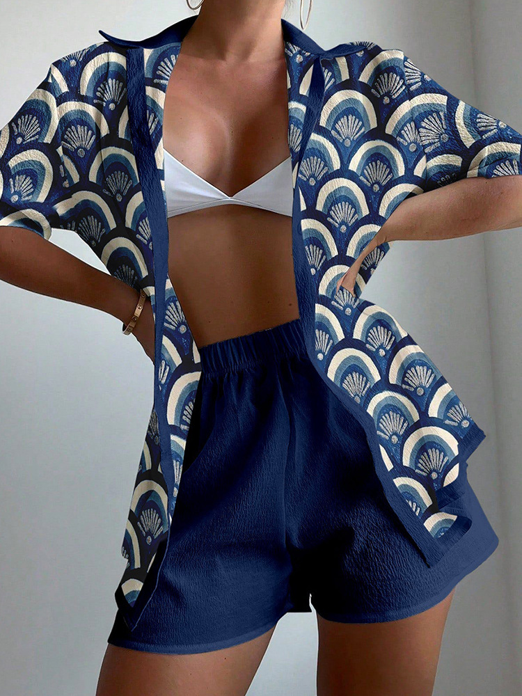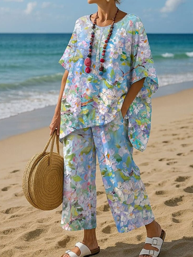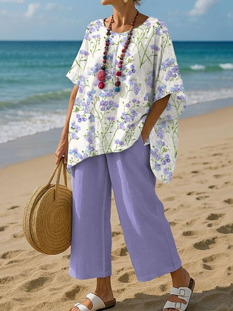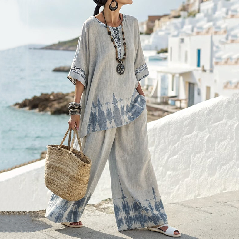 Women's Casual Flax Ethnic Pattern Holiday Two Piece Set