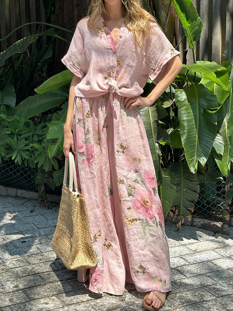 Women's Pink Floral Print Short Sleeve Pants Two-piece Set