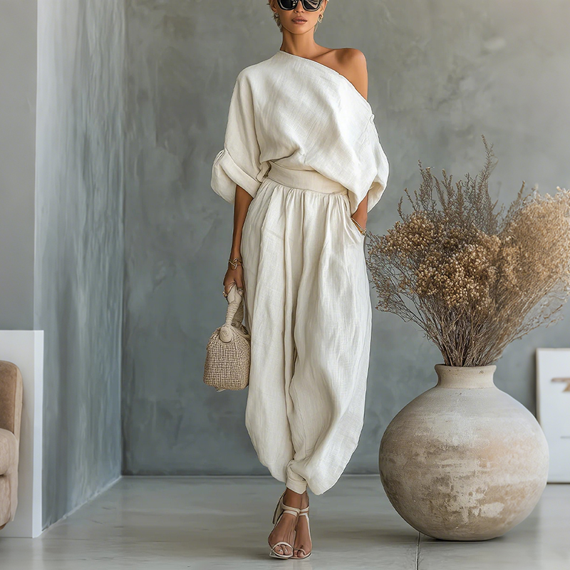 Vintage Classy Blouse & Trousers Linen Two Piece Set
