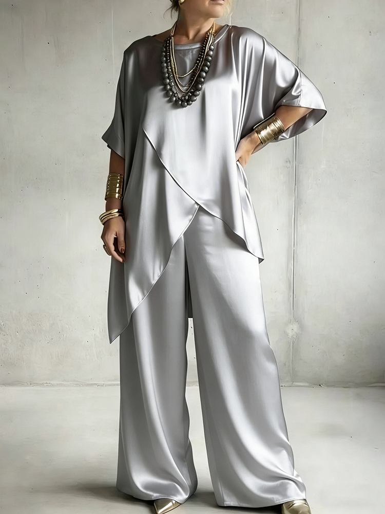 Vintage Elegant Double-layered Satin Top And Pants Two-piece Set