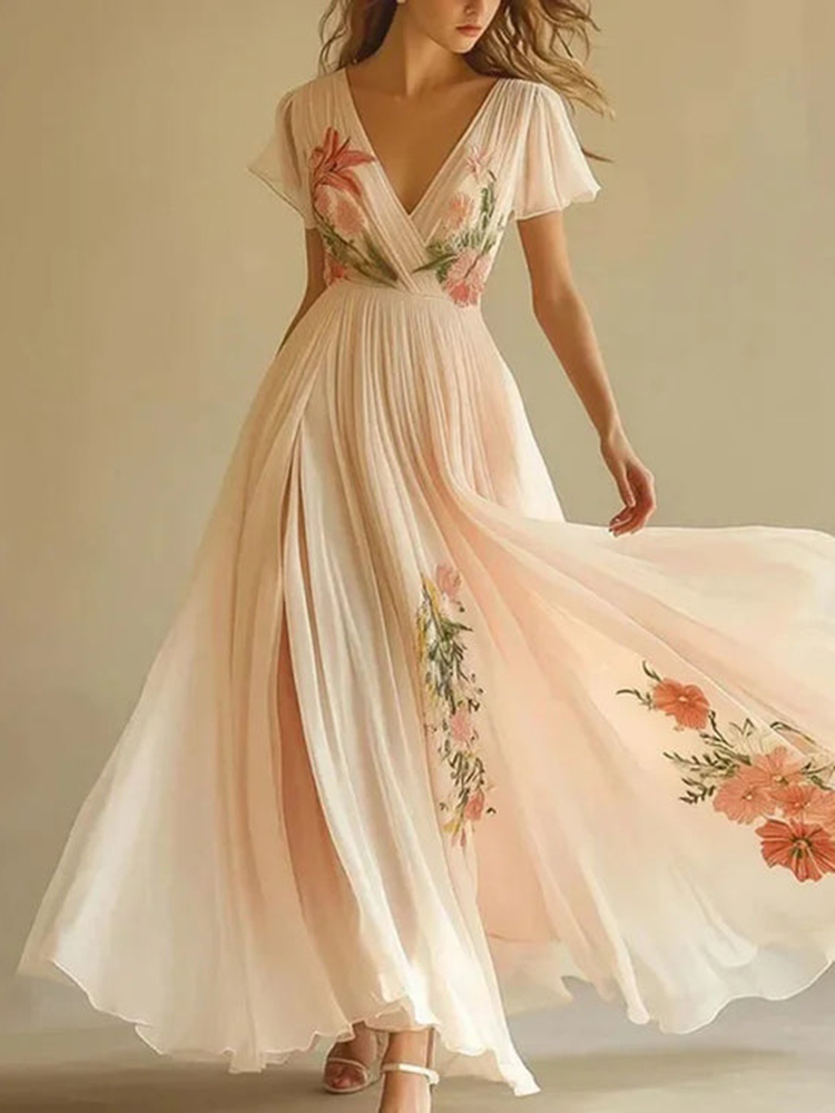 Vintage Ruffles Elegant Chiffon V-neck Flowy Dress