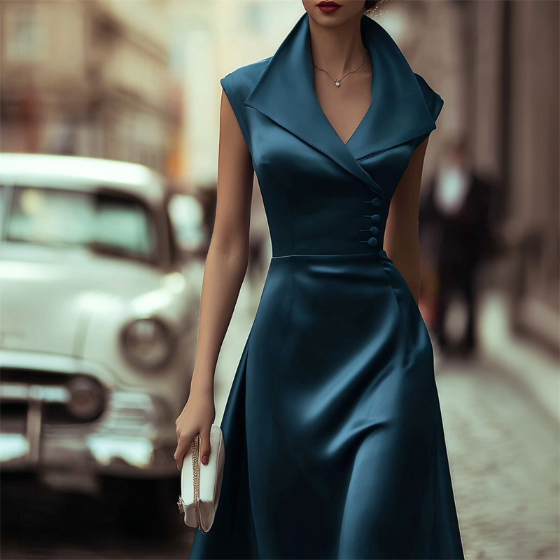 Classy Side Buttons Lapels Flowy Satin Maxi Dress