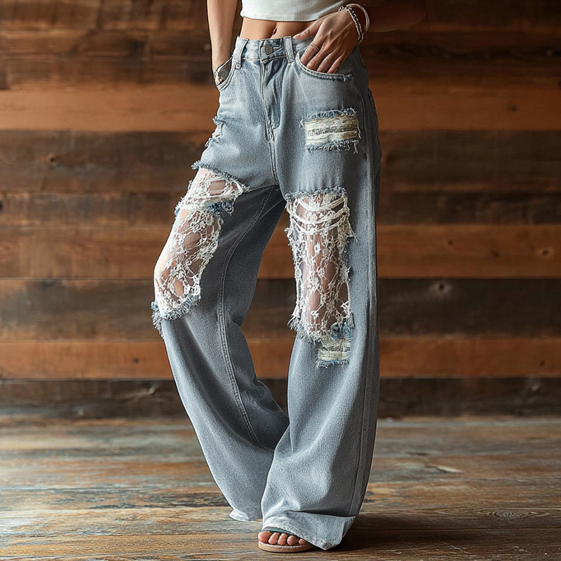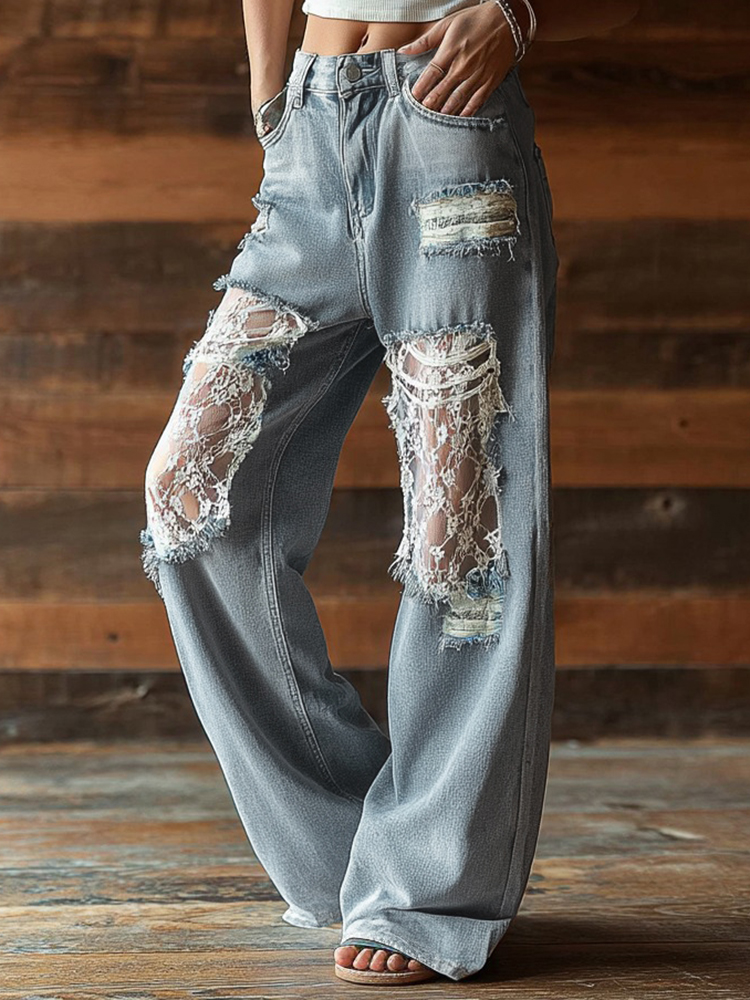 Vintage Bohemian Lace-paneled Distressed Washed Denim Jeans