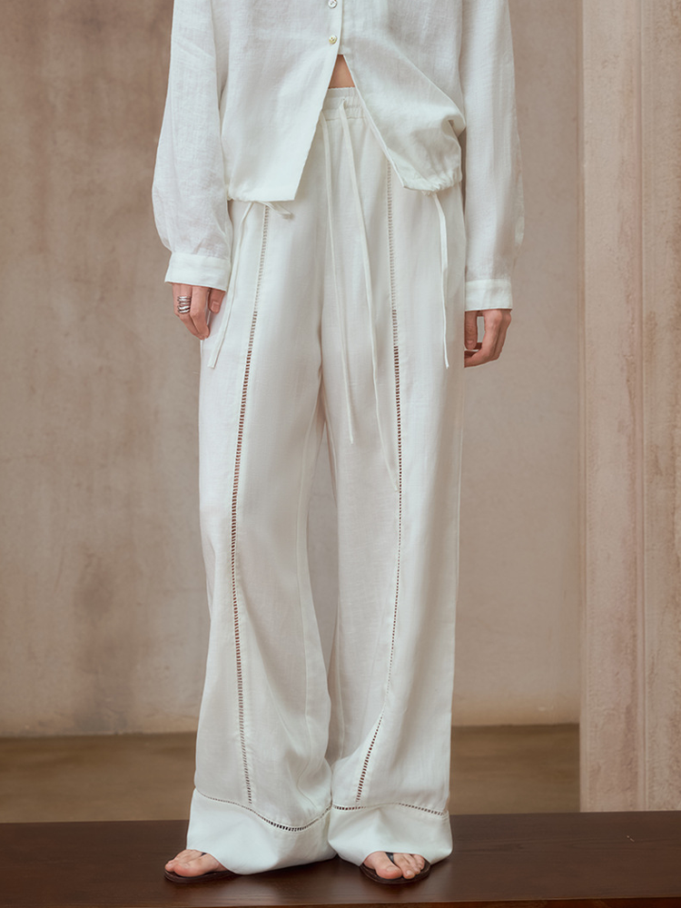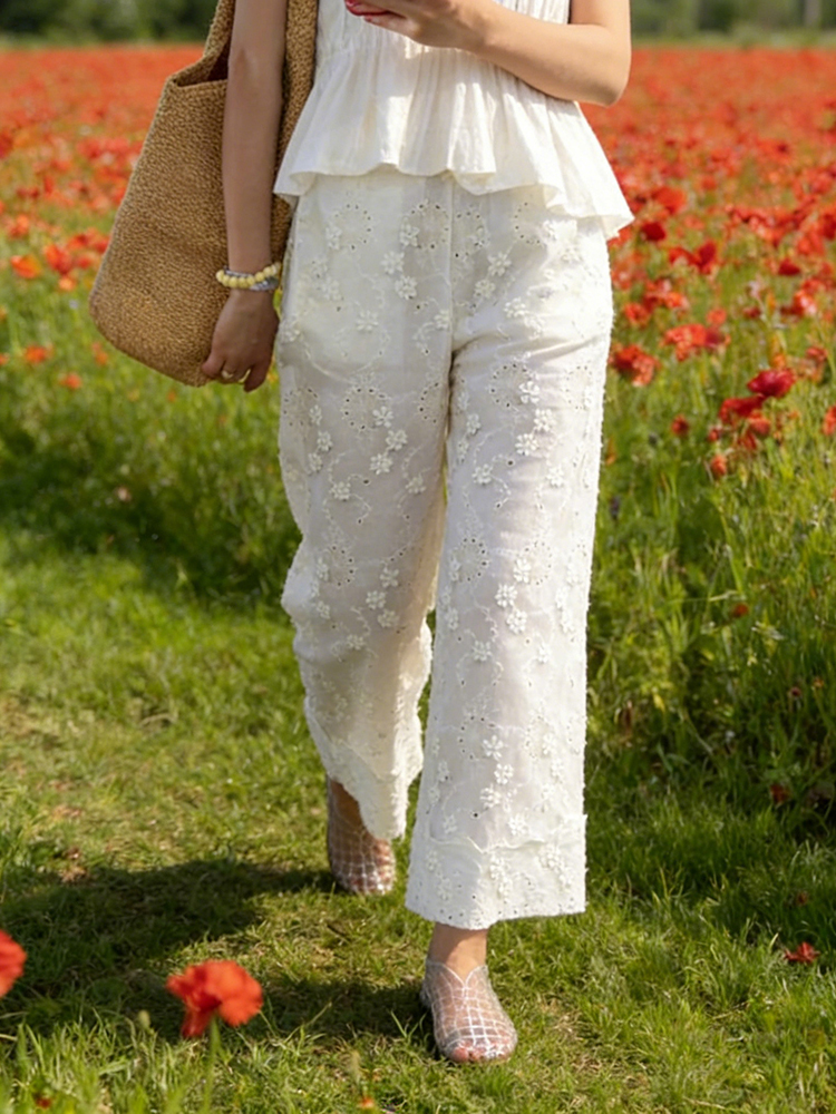 White Openwork Lace Embroidered Wide Leg Casual Pants