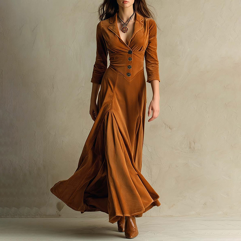 Vintage Solid Color Button Lapel Velvet Maxi Dress