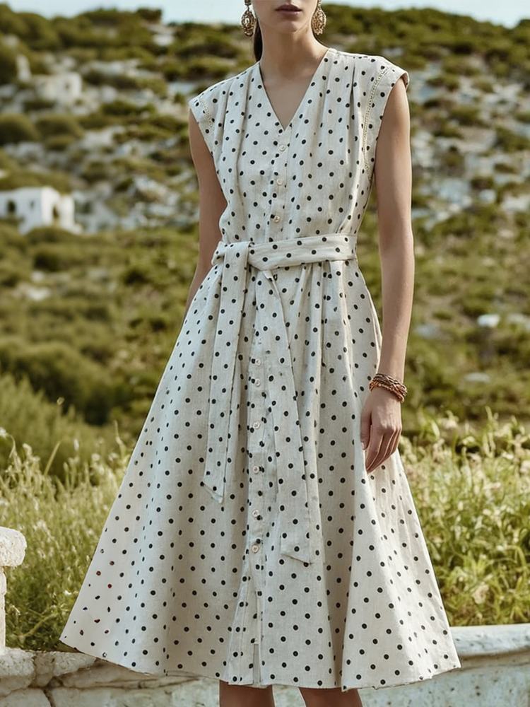 Retro Polka Dot V Neck Sleeveless Linen Maxi Dress