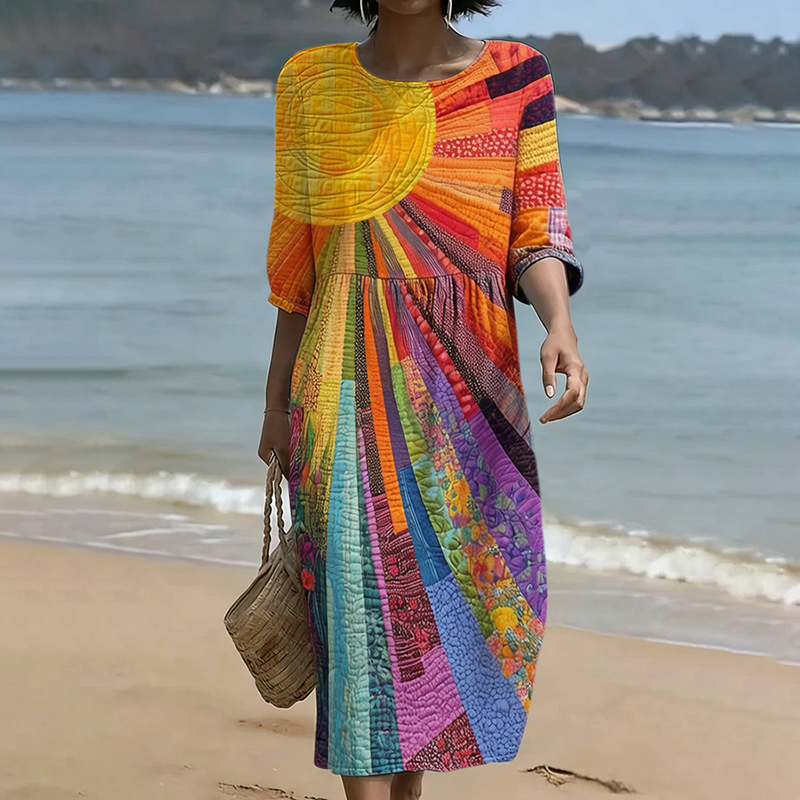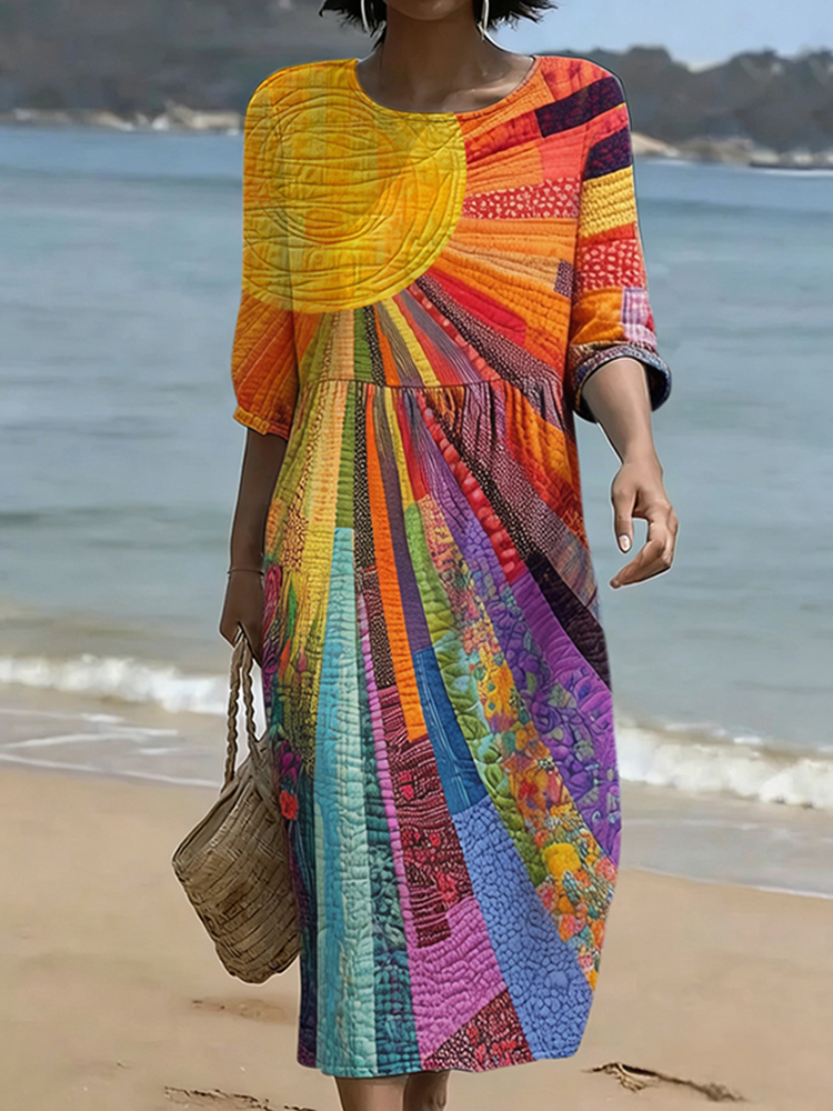 Vintage Colorful Sun Collage Art Linen Blend Loose Three-quarter Sleeve Dress