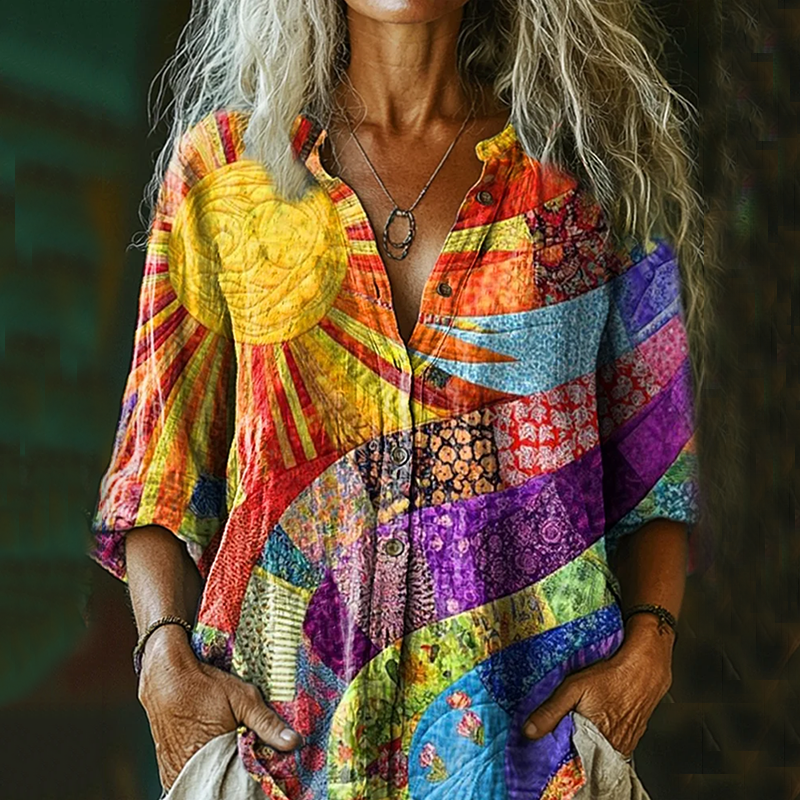Bohemian Style Colorful Sun Floral Collagelinen Print Long Sleeve Shirt