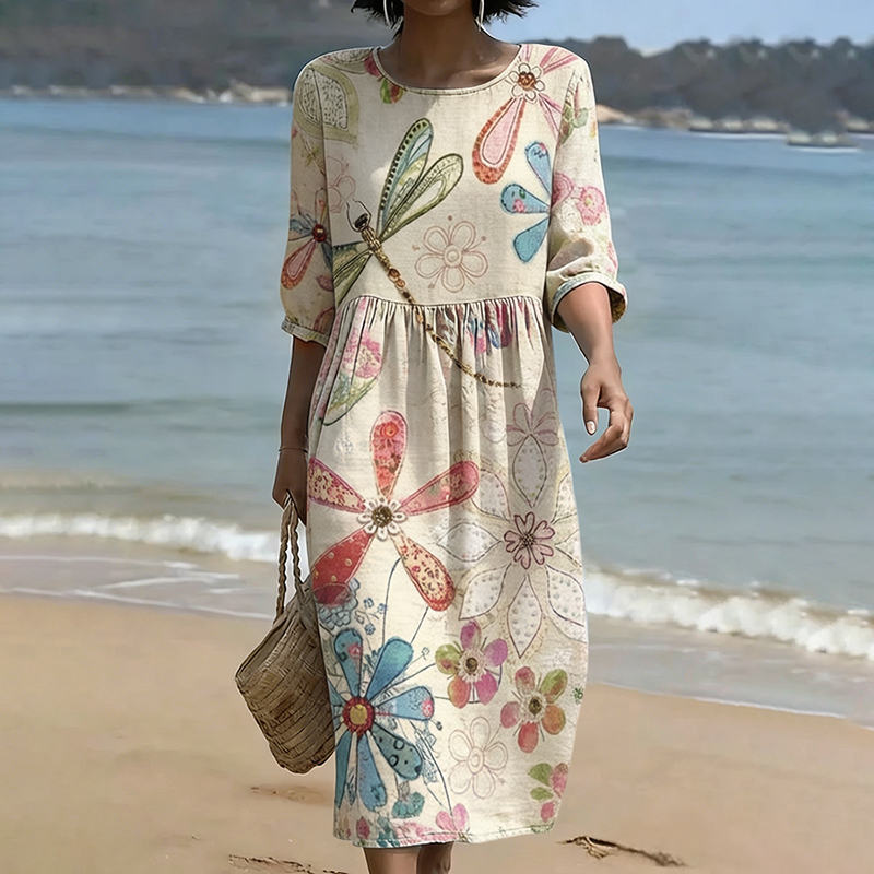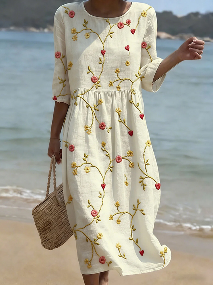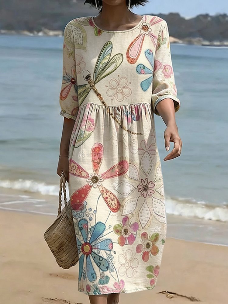 Vintage Floral Art Linen Blend Loose Three-quarter Sleeve Dress