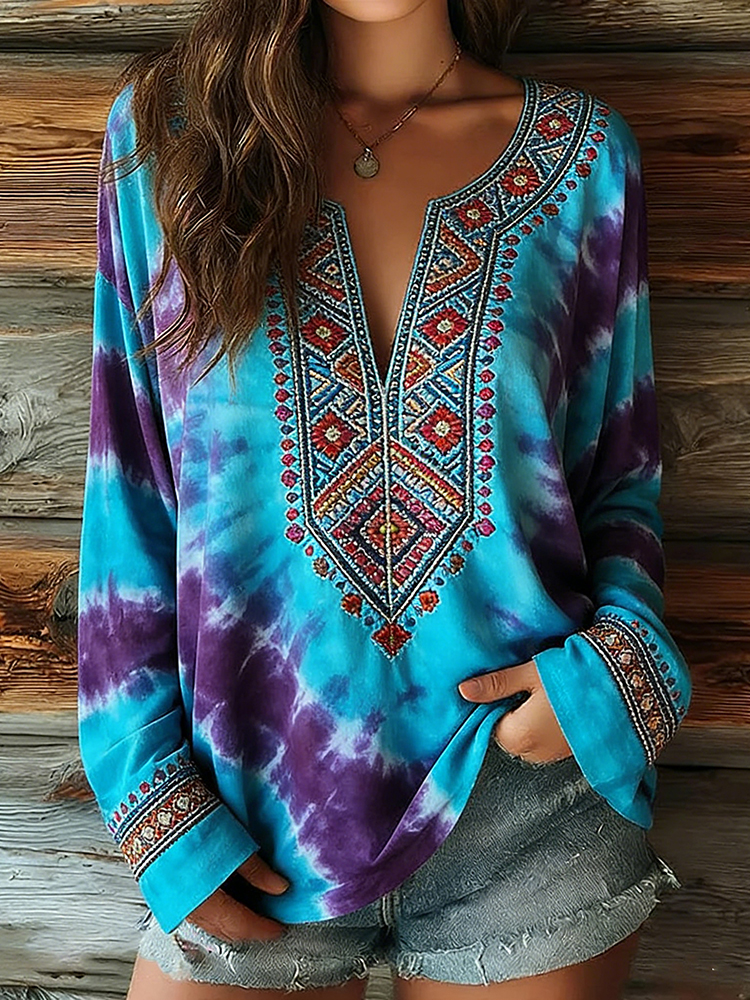 Women's Tie-dye Ethnic Art Pattern Print Casual Long-sleeve T-shirt