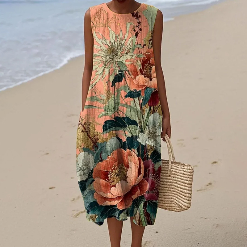 Vintage Floral Art Pattern Linen Blend Tank Dress