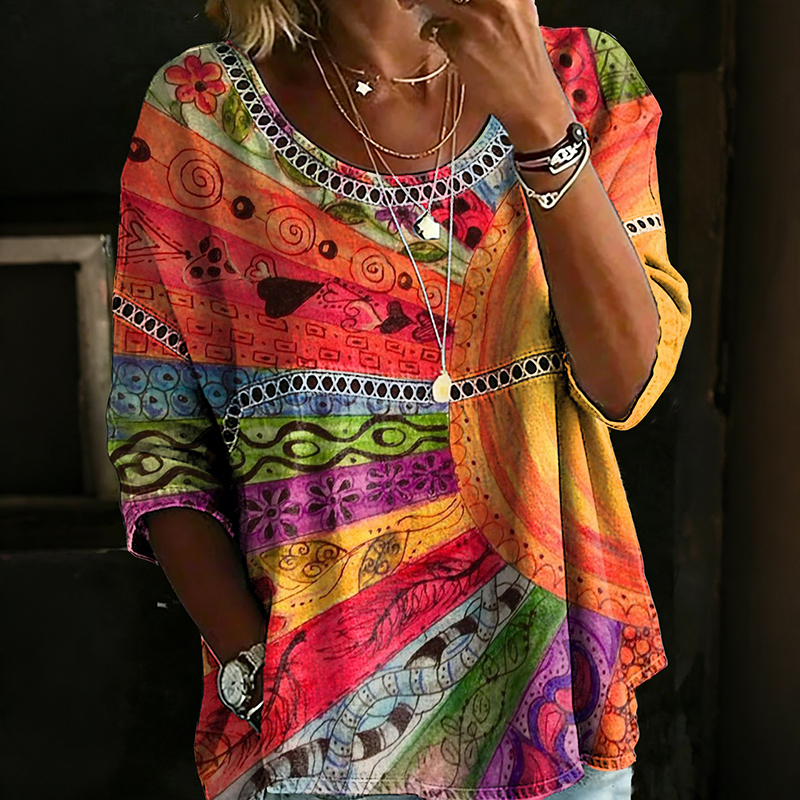 Women's Bohemian Vintage Rainbow Art Print Flowy Linen Blend Casual Tops