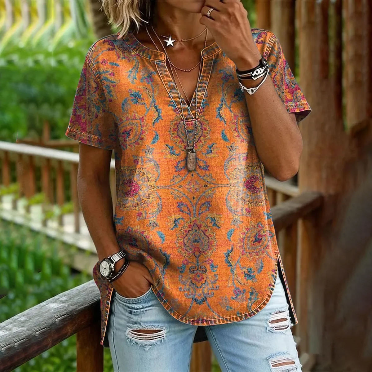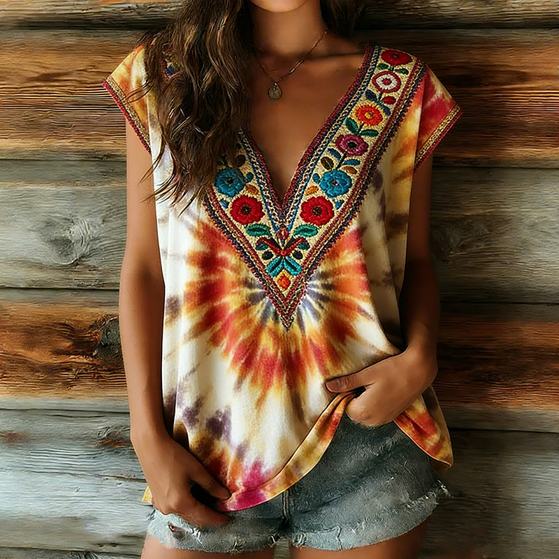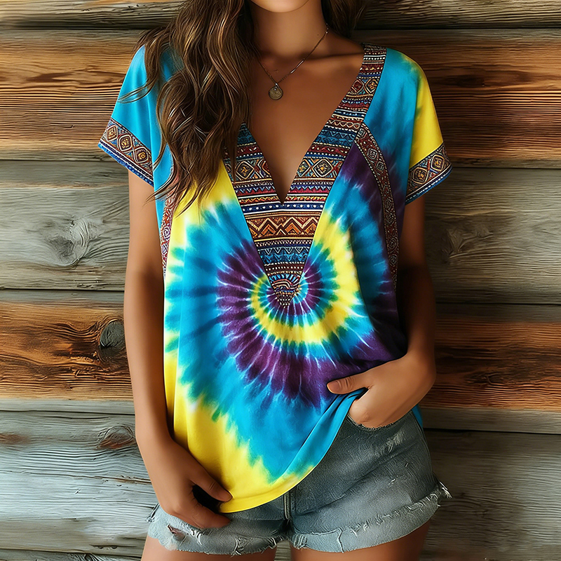 Women's Retro Ethnic Tie-dye Pattern V-neck T-shirt