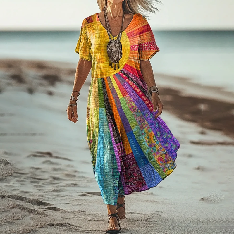 Vintage Colorful Sun Collage Art Pattern Linen Blend V-neck Loose Midi Dress