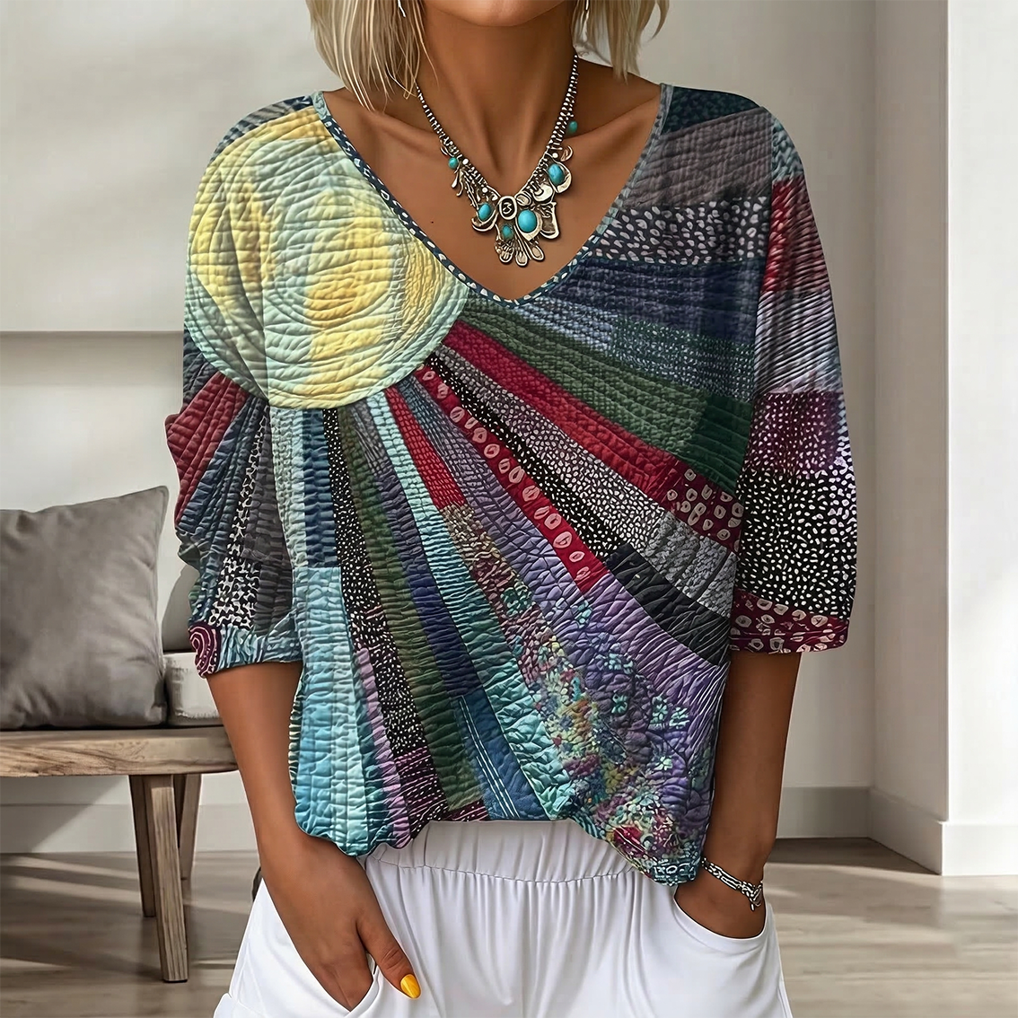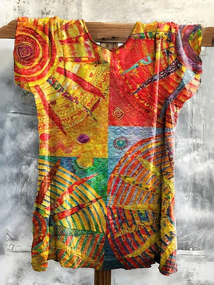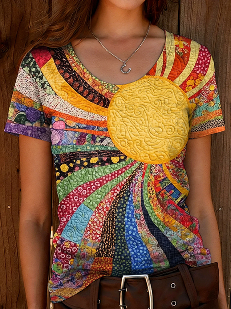 Women's Bohemian Style Sun Patchwork Art Print Casual T-shirt