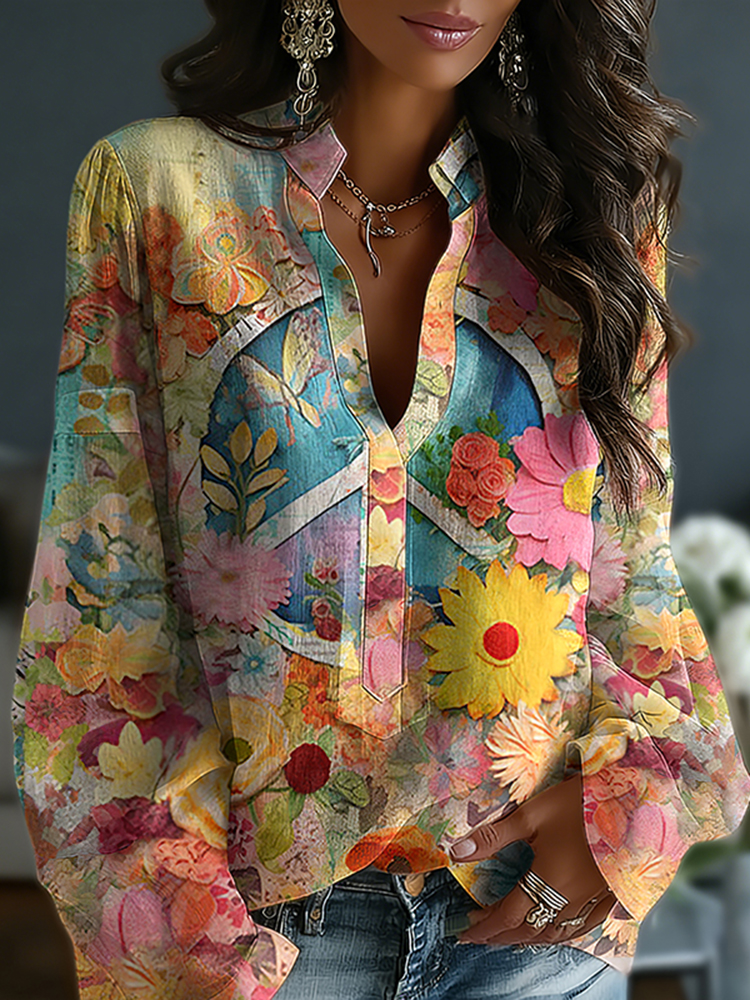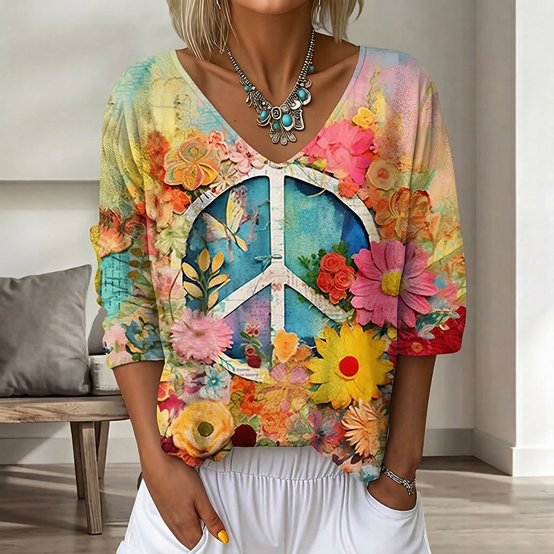 Women's Hippie Peace Pattern V Neck Blouse