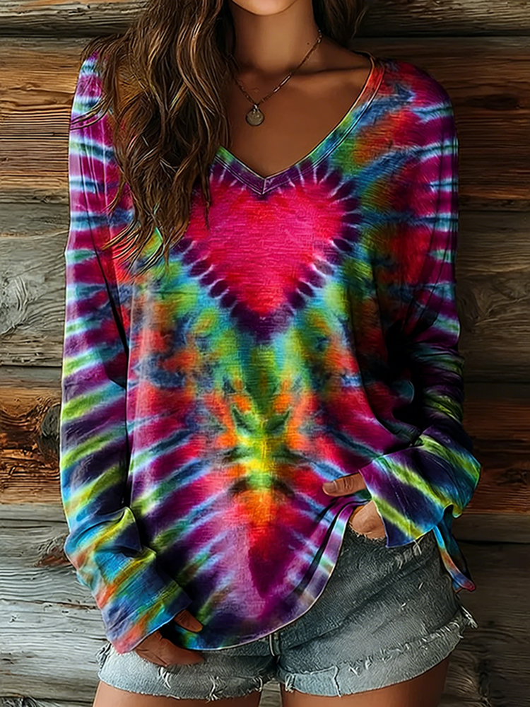 Women's Hippie Heart Tie-dye Art Print Casual V-neck Long Sleeve T-shirt