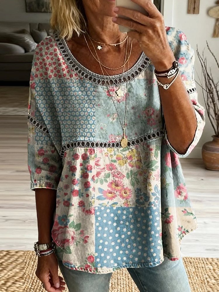 Women's Retro Floral In Patchwork Art Print Flowy Linen Blend Casual Tops