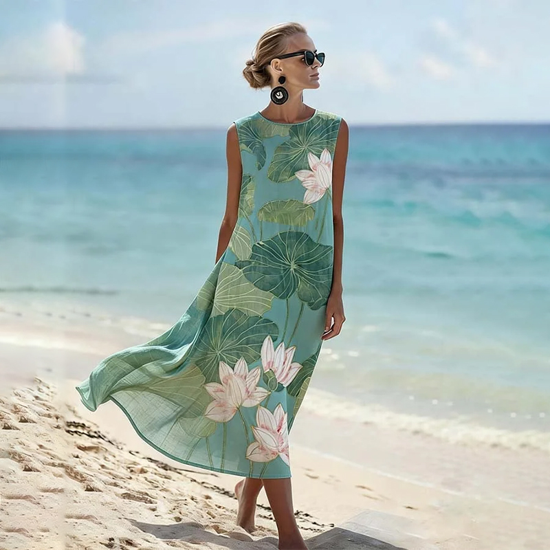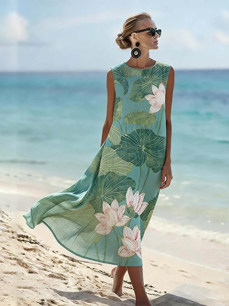 Vintage Lotus Art Pattern Linen Blend Loose Vest Dress