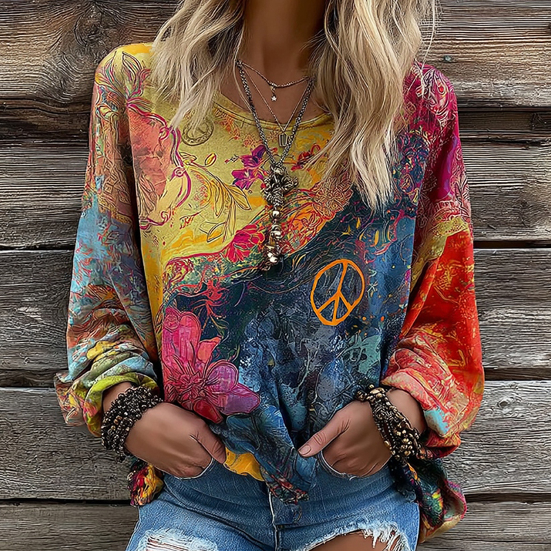 Women's Hippie Sun And Floral Print Blouse