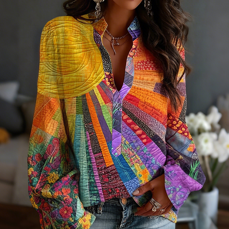 Women's Vintage Patchwork Art Print Flowy Linen Blend Casual Tops