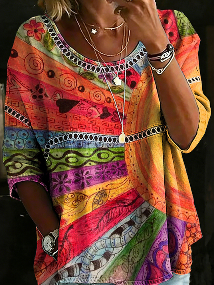Women's Retro Colorful Ethnic Floral Art Print Crew Neck Cotton T-shirt