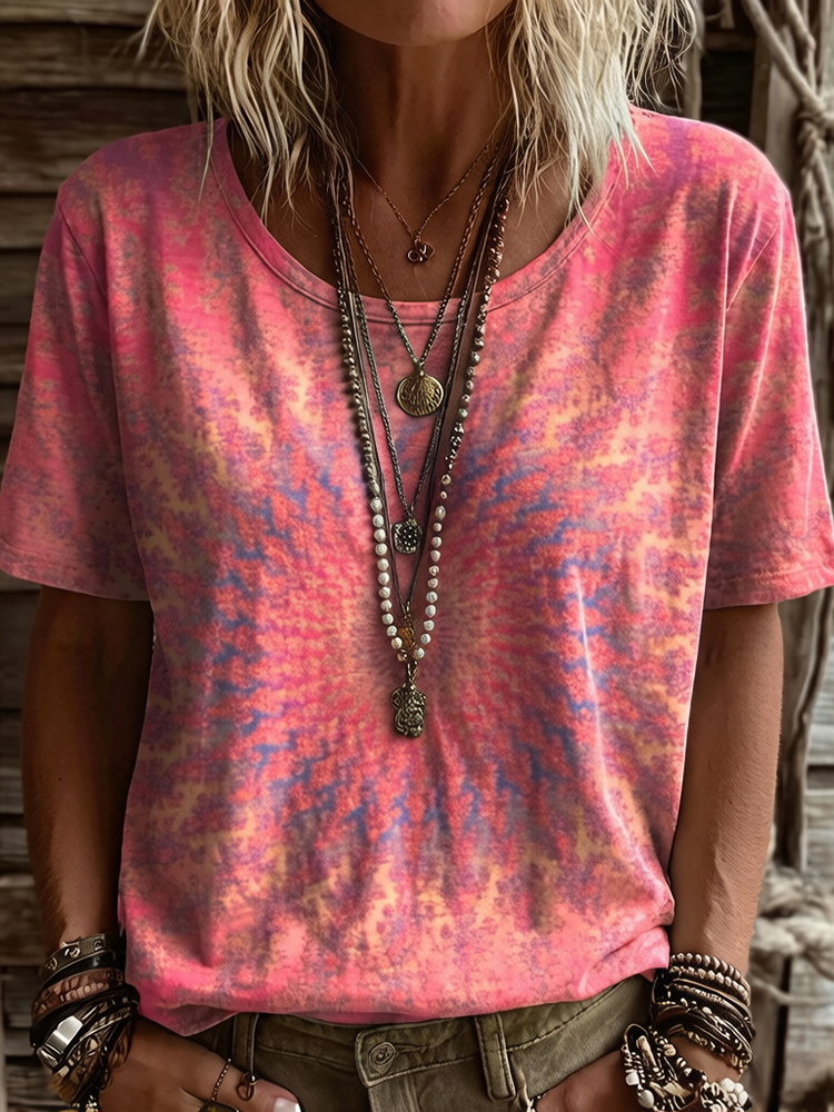 Women's Hippie Abstract Cat Tie-dye Pattern Casual T-shirt