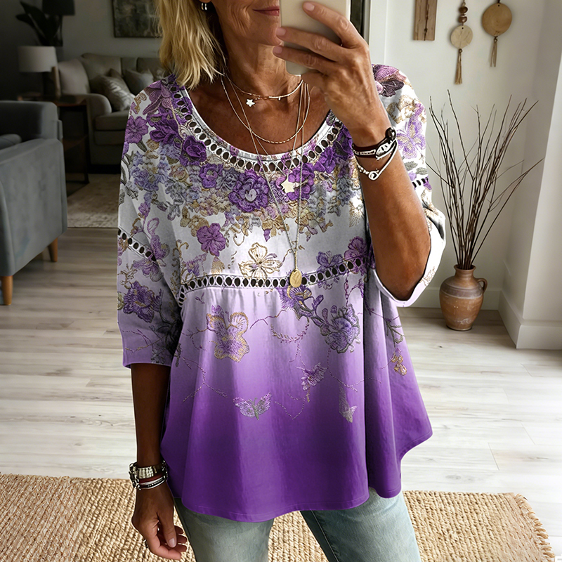 Women's Vintage Floral In Gradient Art Print Flowy Linen Blend Casual Tops