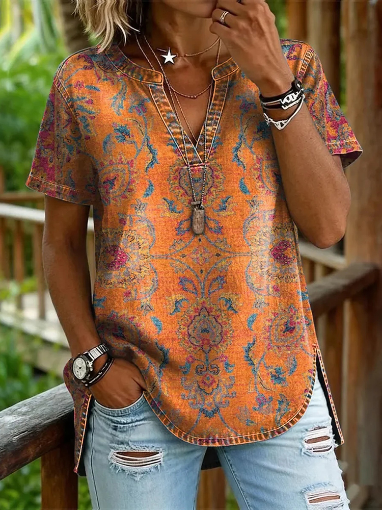 Women's Retro Ethnic Floral Print V-neck Short Sleeve Blouses