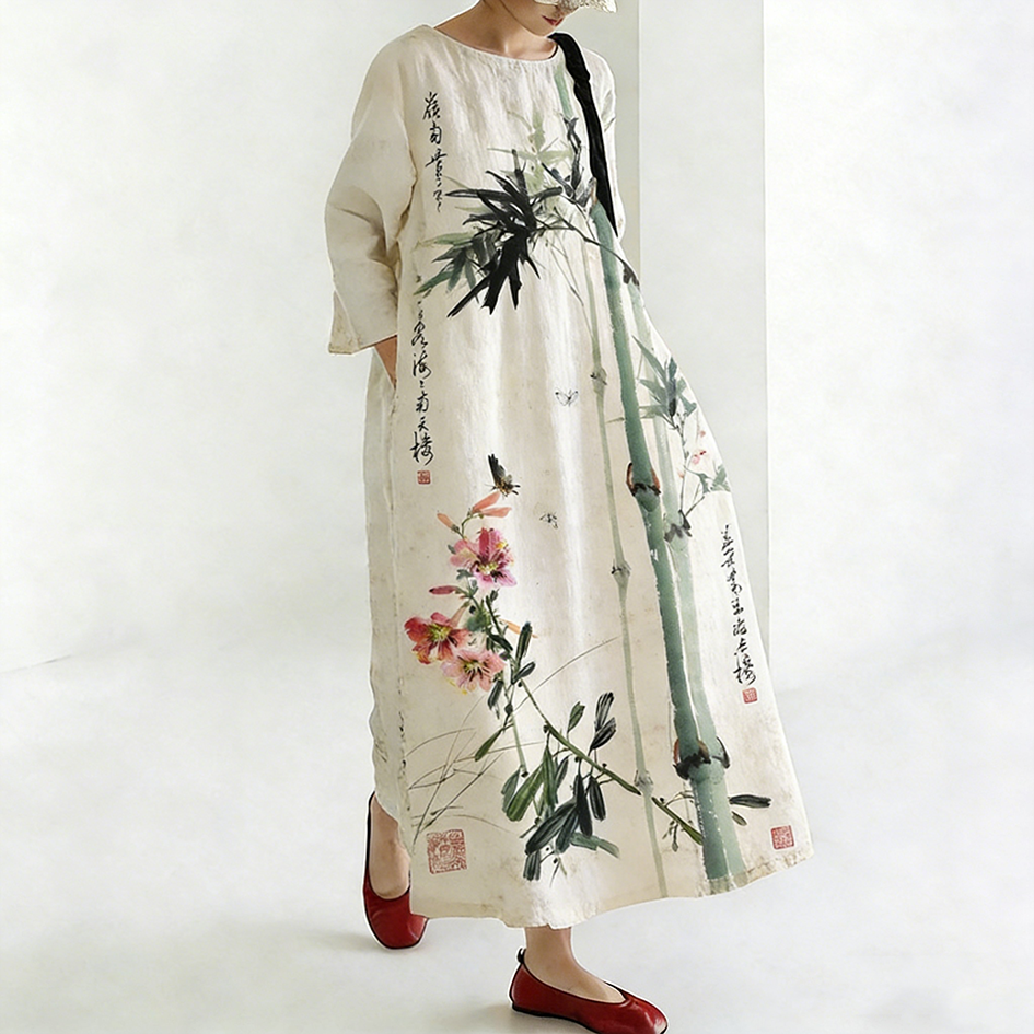Vintage Japanese Floral Art Pattern Flowy Linen Maxi Dress