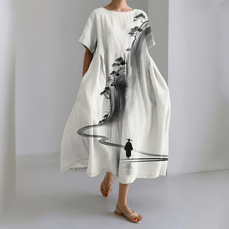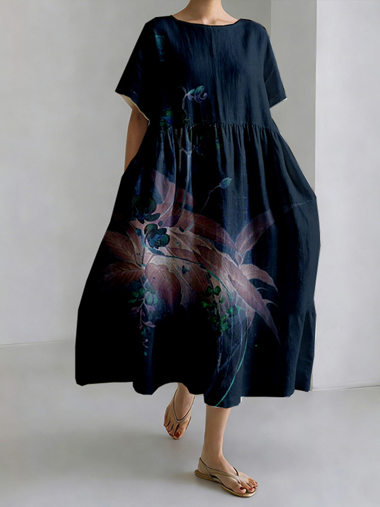 Women's Japanese Ink Painting Style Ocean Plant Pattern Comfortable Dress