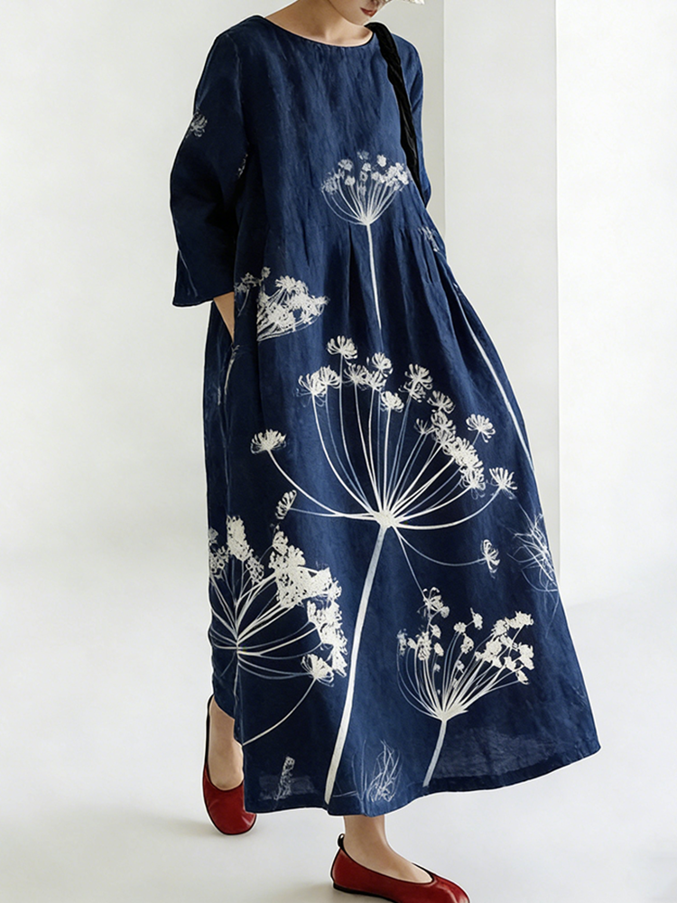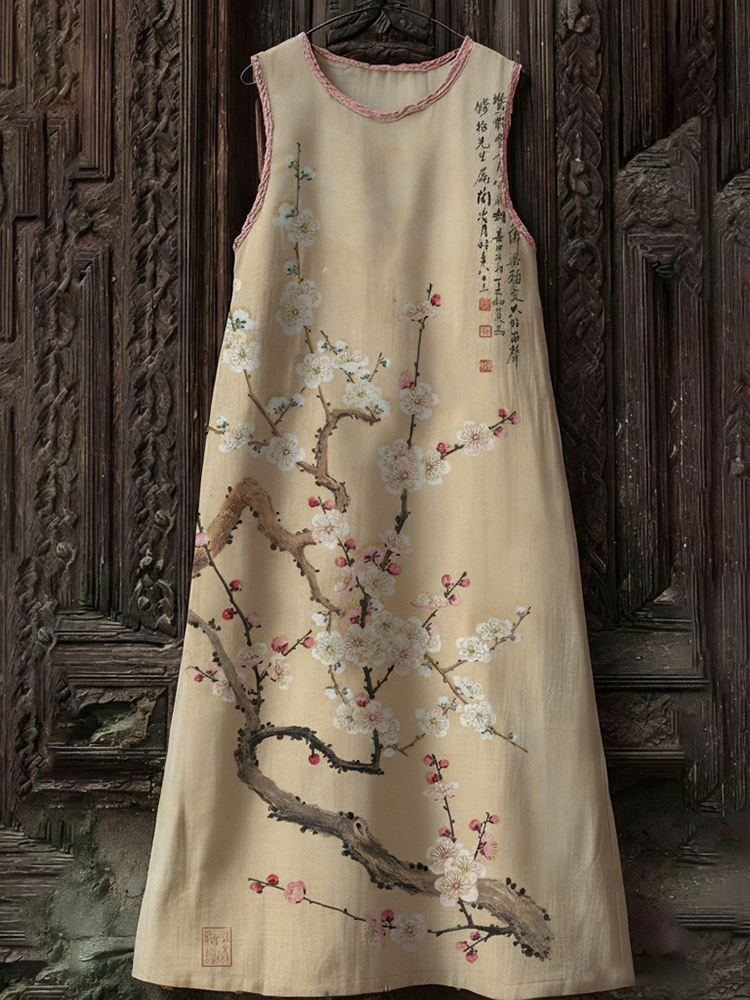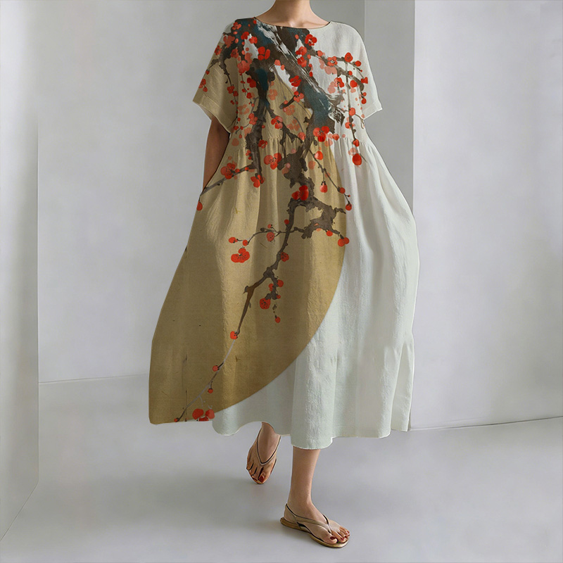 Japanese Style Plum Blossom Cotton Linen Round Neck Dress